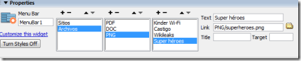 Si te fijas, tengo 3 ventanas de opciones. Estas permiten que tenga un menú principal y hasta 2 subniveles. En mi caso, voy a modificar las opciones de Sitios (que tiene las opciones Item 1.1, Item 1.2 e Item 1.3) para poner vínculos a mis sitios. Cambiar nombres se hace igual que como expliqué con anterioridad, solo que ahora voy a cambiar la propiedad Link. Así se ve con el primero cambiado:
